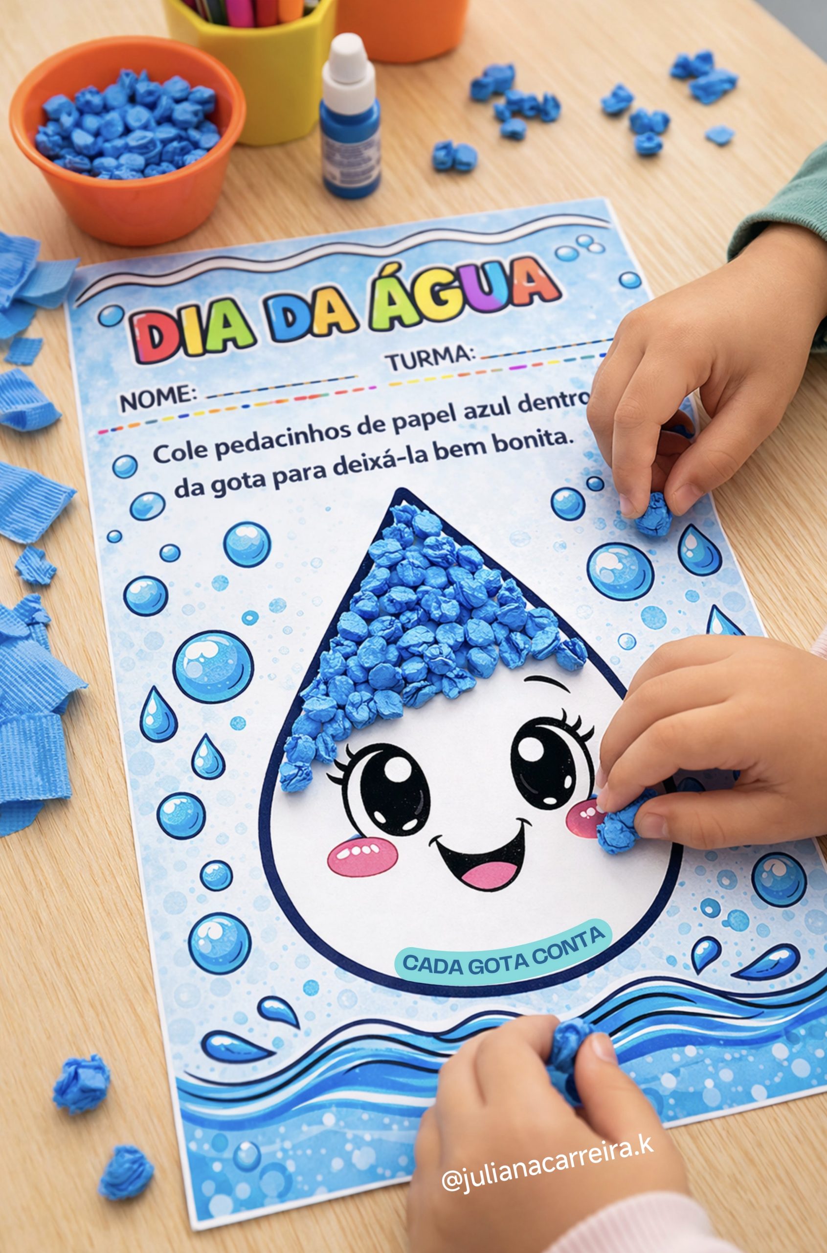 Nesta atividade, os alunos colam pedacinhos de papel azul dentro da gota, desenvolvendo coordenação motora, concentração e consciência ambiental de forma divertida.