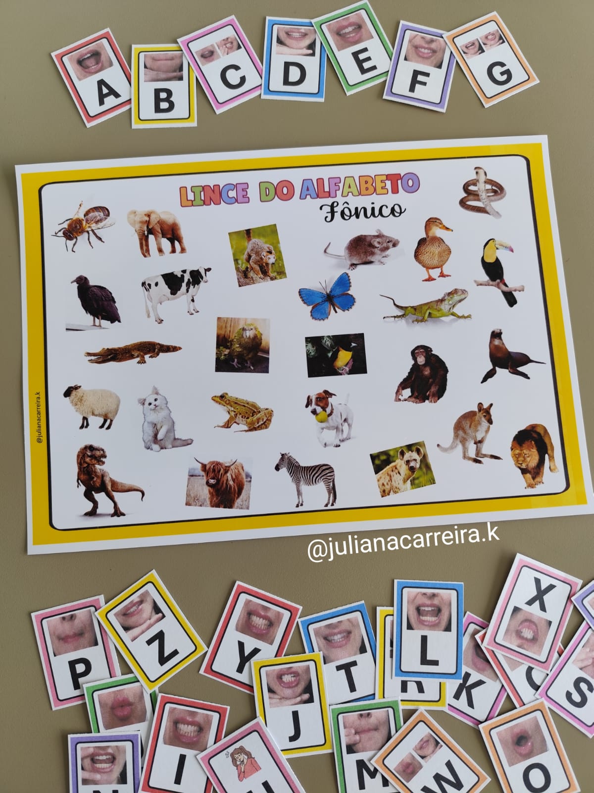 Com imagens, animais e o apoio visual dos movimentos da boca 👄, a criança associa som + letra de forma lúdica e prática.