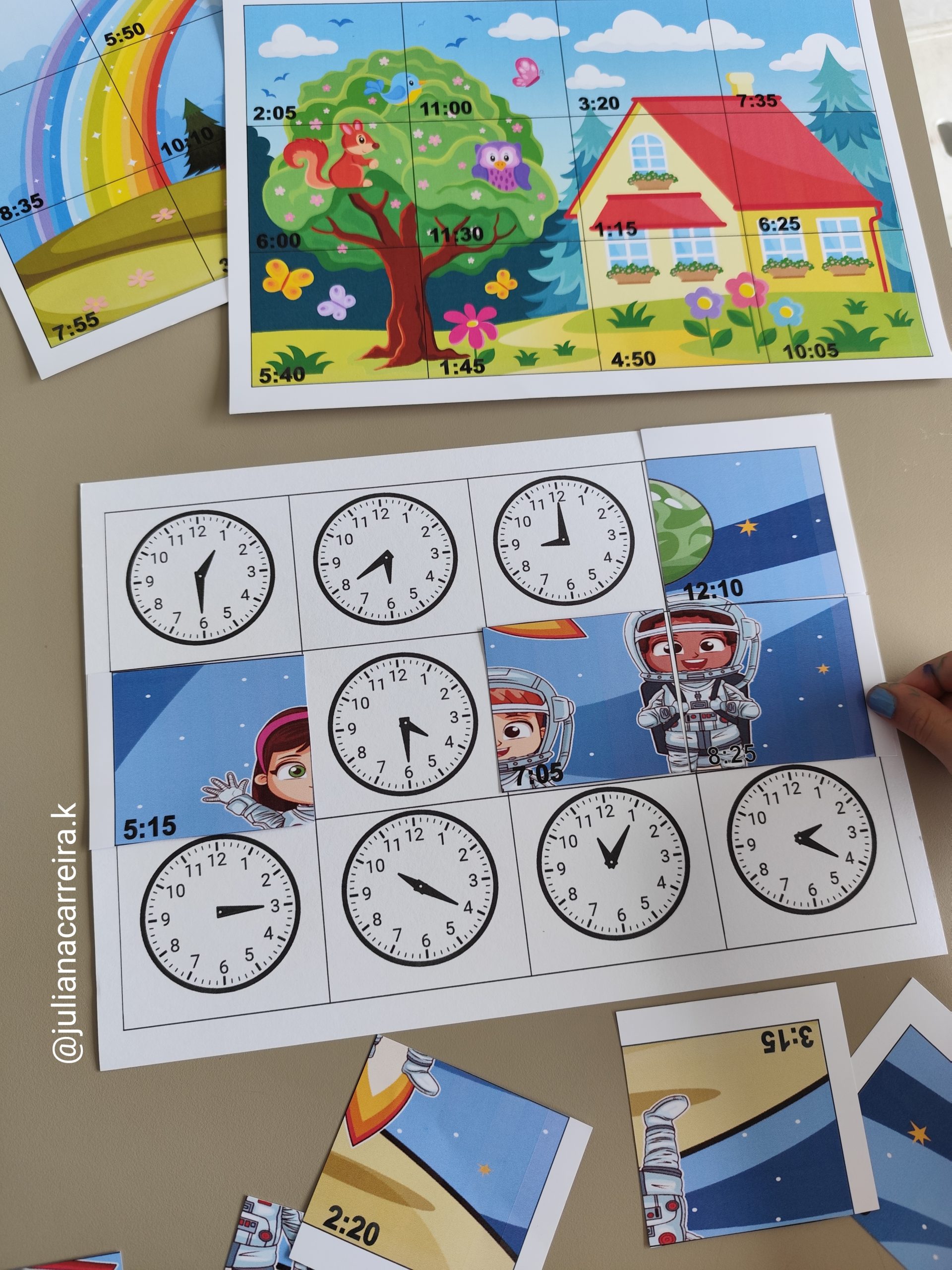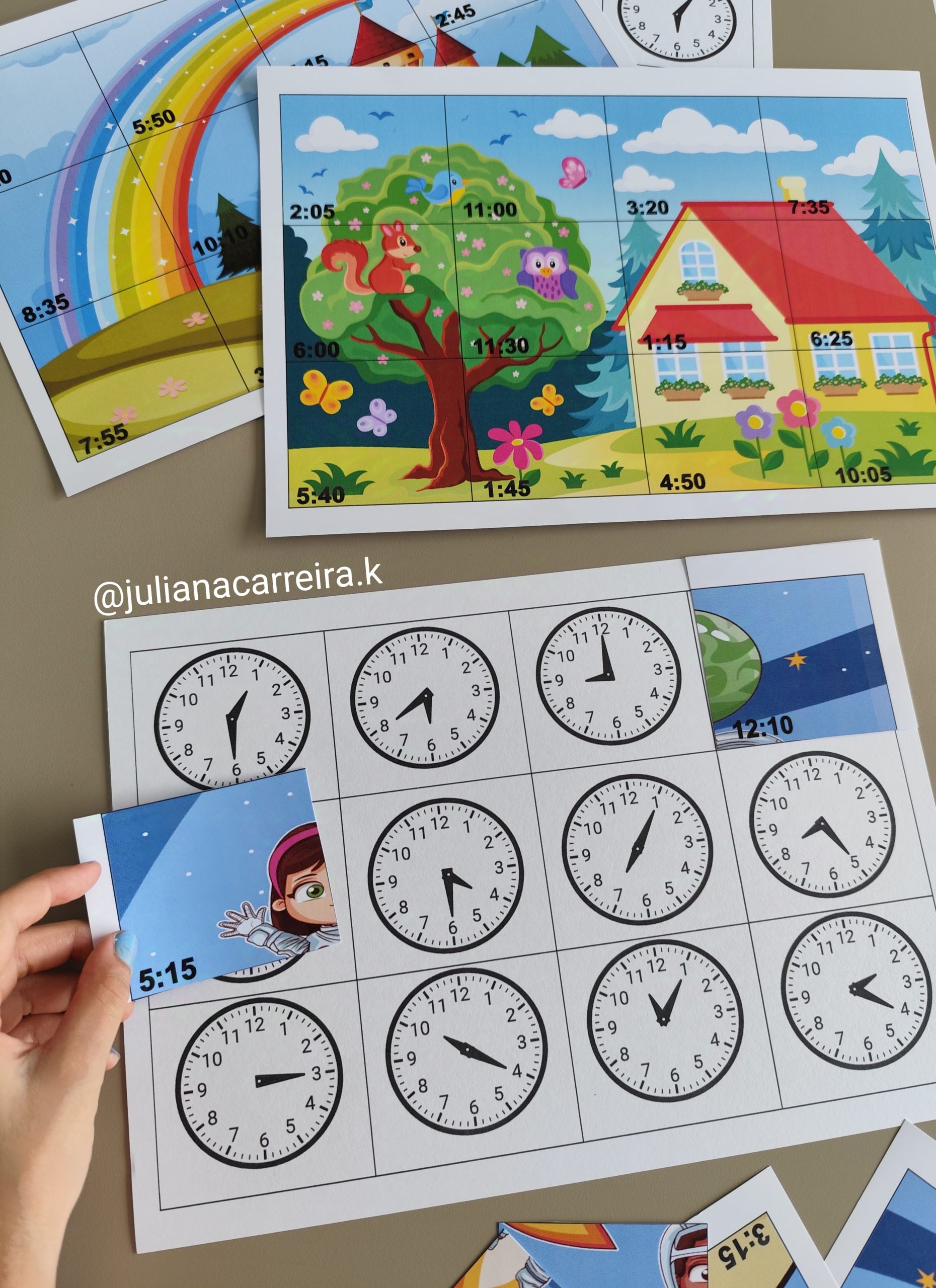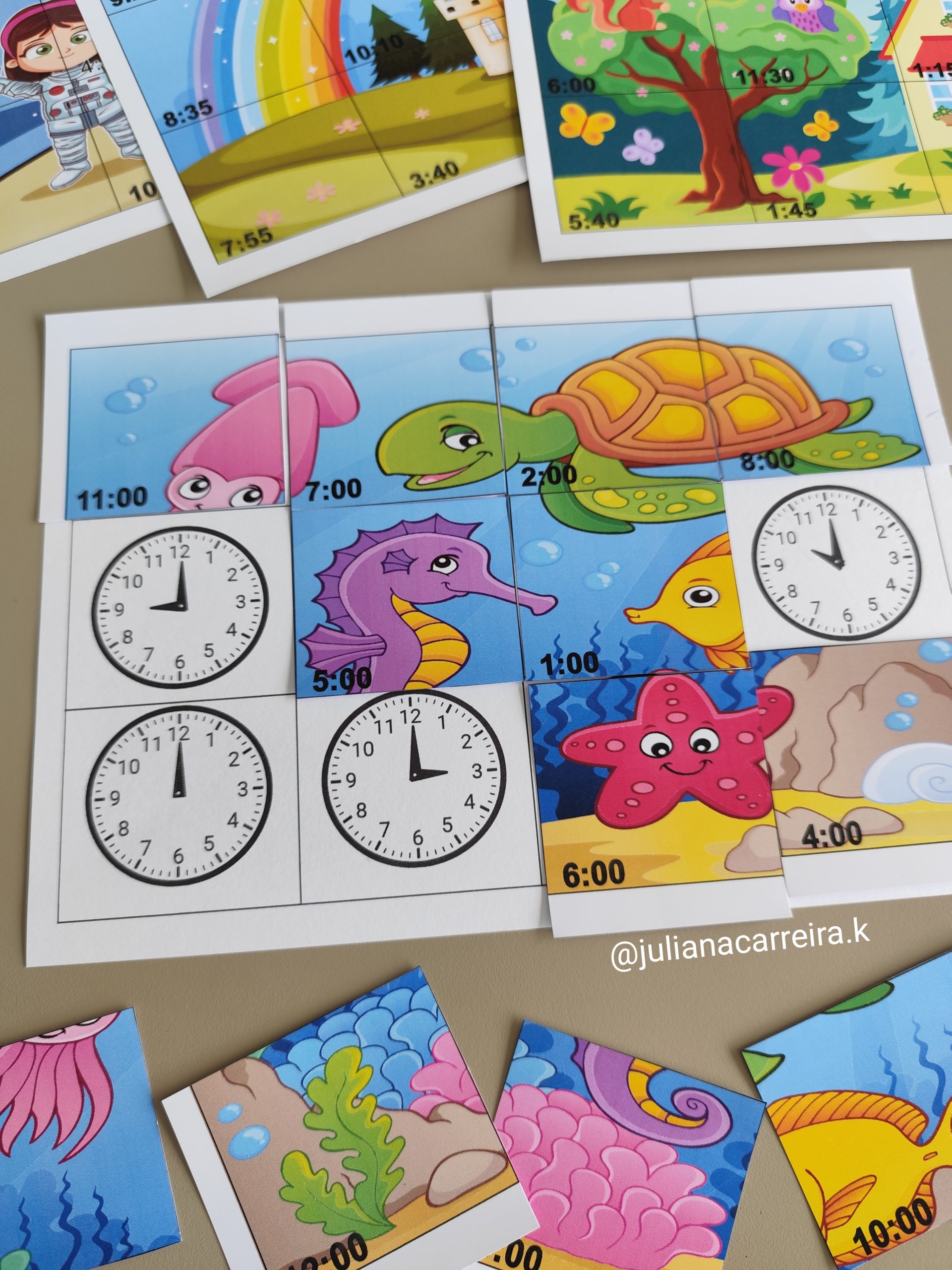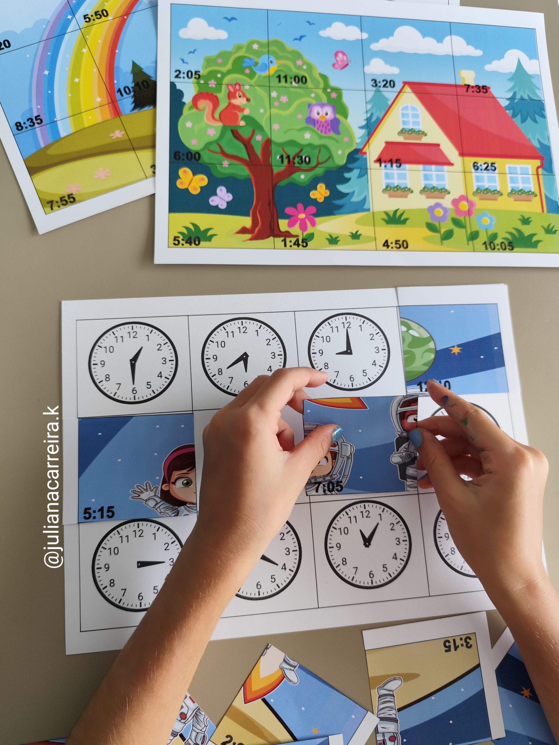 A criança associa os horários digitais e analógicos montando o quebra-cabeça.