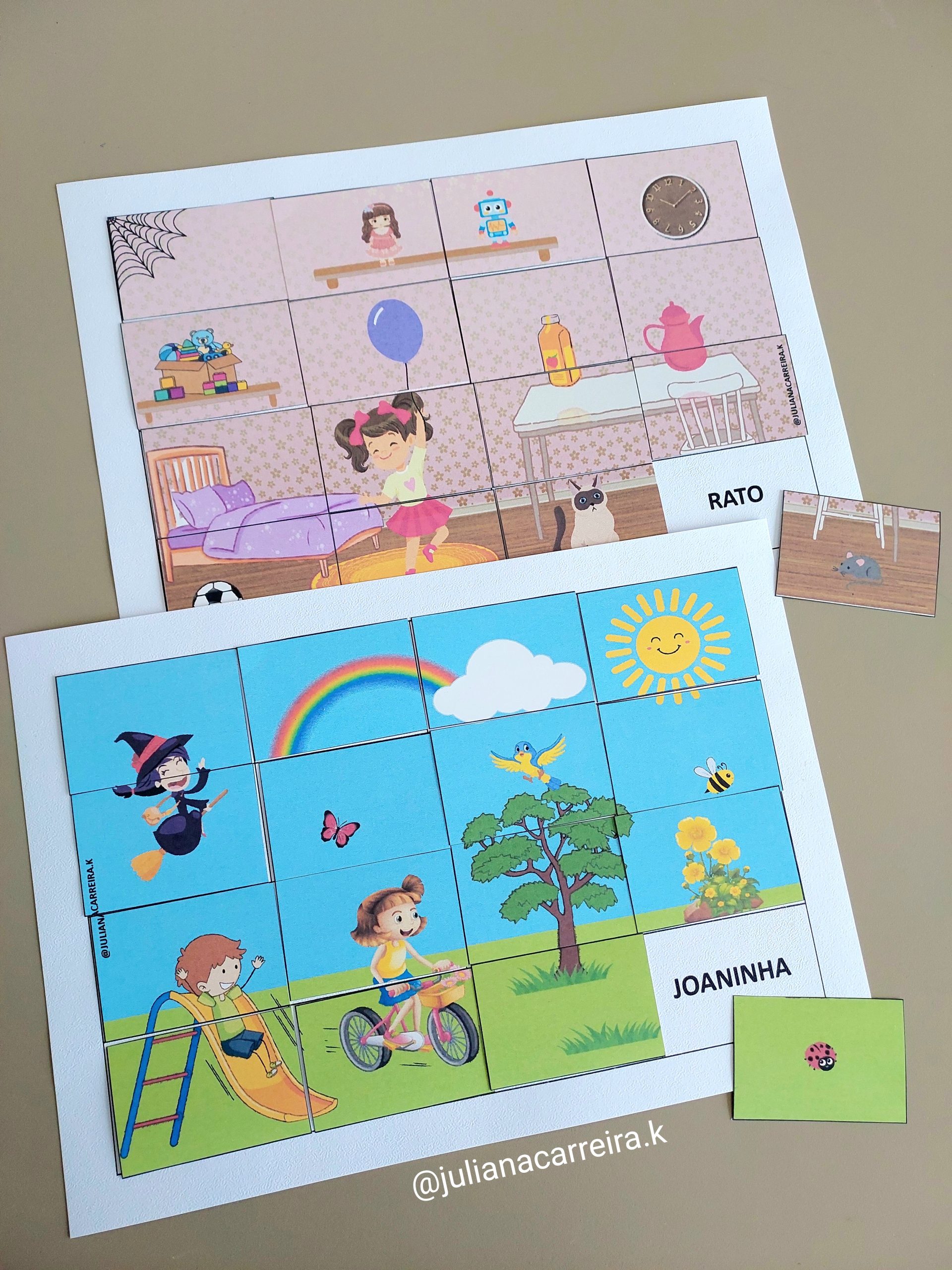 Arquivo em PDF contendo 2 quebra-cabeças de 16 peças cada, sendo um com palavras Sílabas Simples e outro com palavras Sílabas Complexas. A tarefa da criança consiste em ler e encaixar as peças do quebra-cabeça de acordo com as imagens.