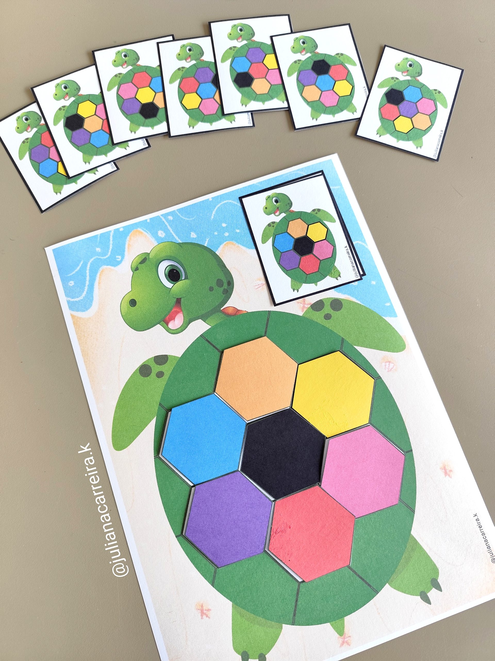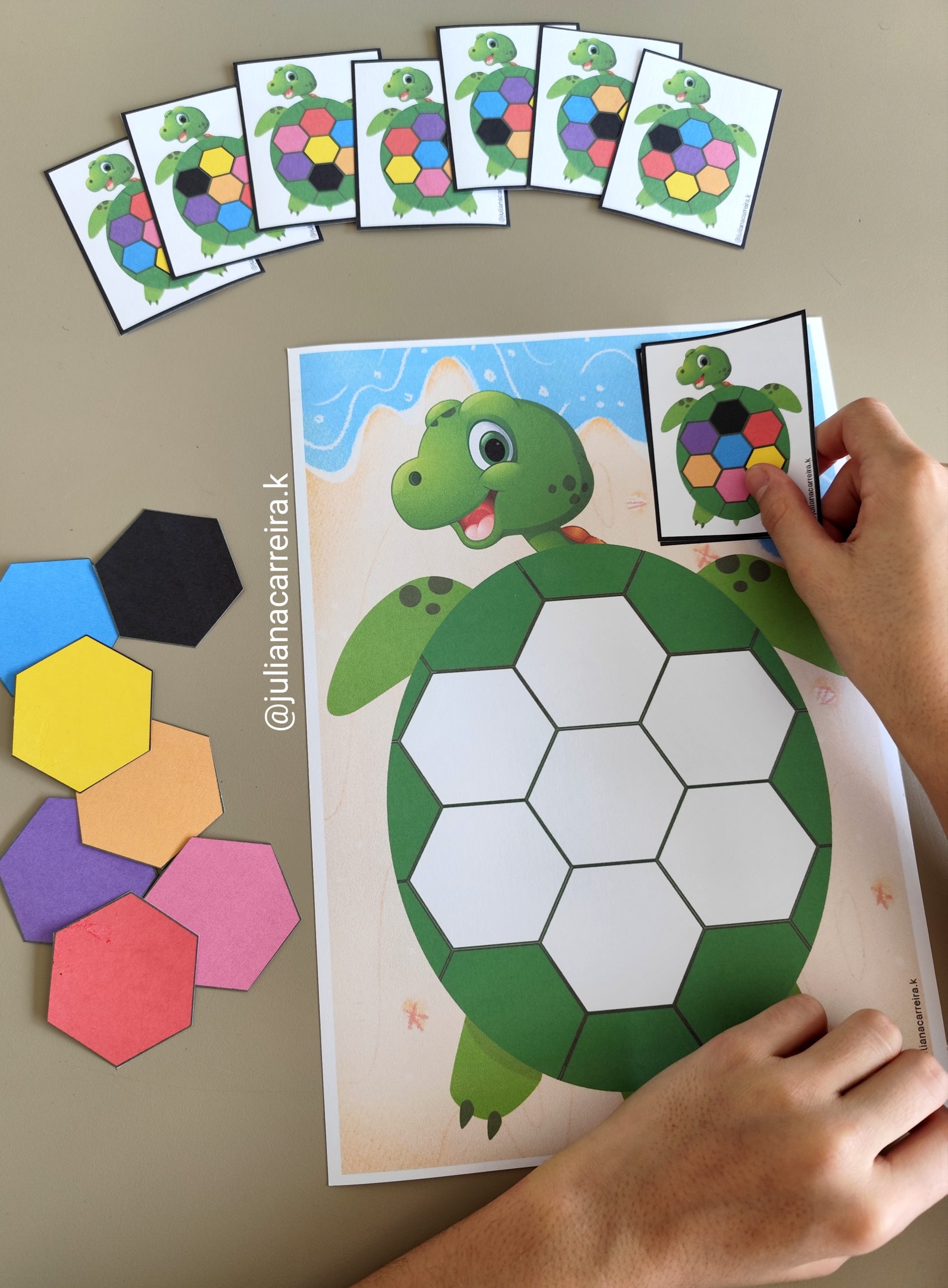 Elas observam o modelo e reproduzem a sequência de cores no casco da tartaruga, desenvolvendo atenção, memória e coordenação motora. 🌈✨